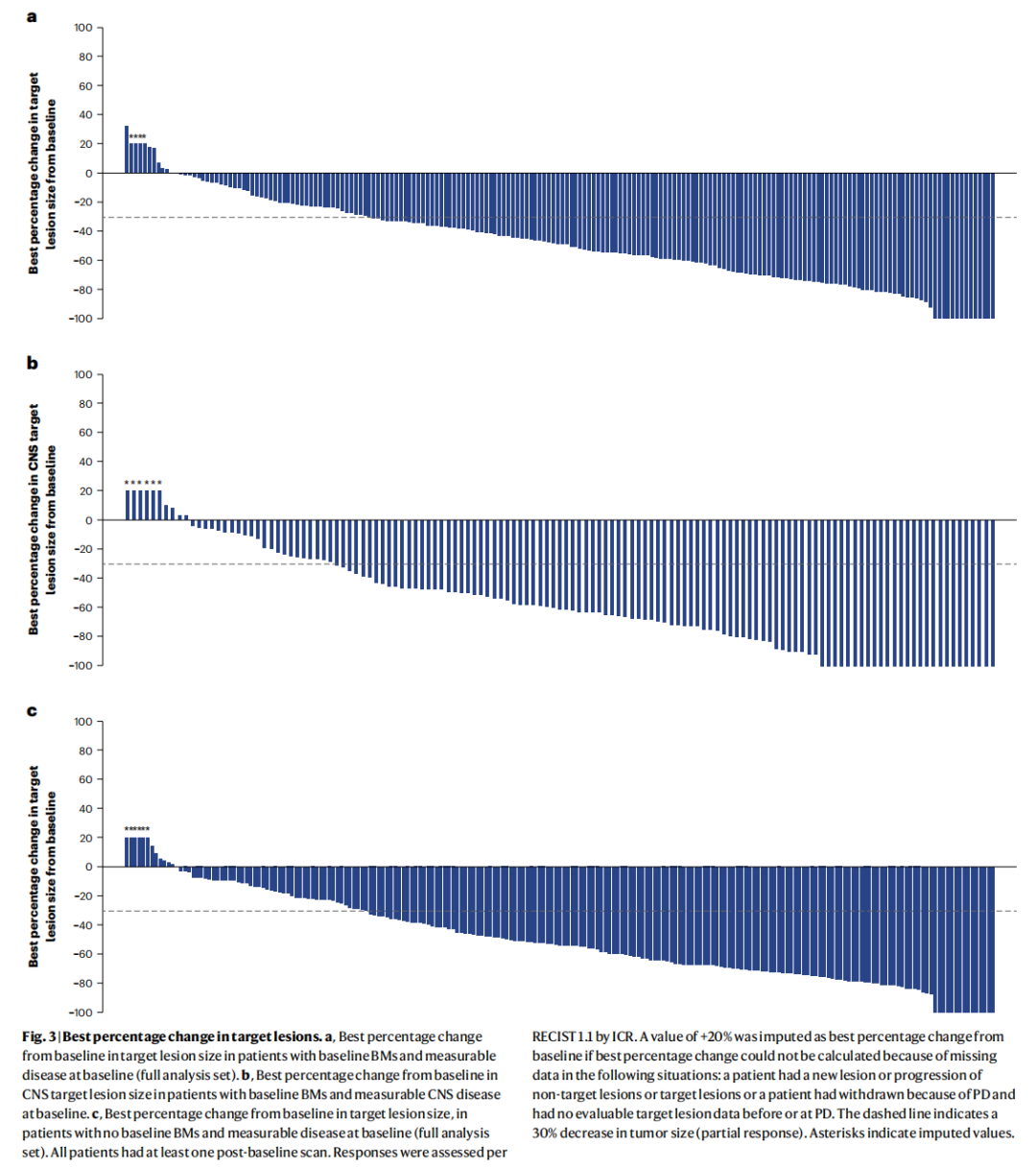 至疾病进展时间(从首次给药至记录到疾病进展的时间)、至第二次疾病进展时间(PFS2)、总生存期(OS)数据不成熟。12个月时PFS2为83.1%(95%CI:77.5-87.4),12个月OS为90.3%(95%CI:85.9-93.4)(图2b和表1)。在基线脑转移全分析集中,经证实的ORR为51.7%(95%CI:45.7-57.8)(表1)。稳定性和活动性脑转移患者的ORR分别为49.7%(95%CI:41.9-57.5)和54.7%(95%CI:45.2-64.2)(表1)。靶病变大小的最佳变化百分比如图3a所示。