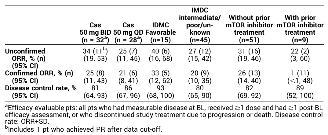 这项研究纳入了既往经过抗PD-(L)1单抗和VEGFR-酪氨酸激酶抑制剂治疗的患者,接受casdatifan单药治疗(5个剂量递增组和4个剂量扩展组),试验终点包括治疗中出现的不良事件(TEAE)发生率和客观缓解率。
