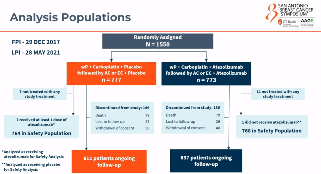 So it was a pretty broad eligibility criteria.The median age of our patients was 49,so it was a younger patient population,but a pretty healthy population.In terms of our stratification variables that we chose for our study,since we were doing recruitment here in the U.S.and Canada.The Germans were going to be doing recruitment in Spain and Germany.So we made continent,so to speak,Europe or U.S.,one of our stratification factors.We made clinical nodal status,a stratification factor,positive versus negative.We also made tumor size.We decided to split our three centimeters.The typical T and M is zero to two,two to five,five or greater.But we knew that if we kind of wanted to have roughly equal groups,so we said up to three and above three,that was a stratification variable.We included PD-L1 as a stratification,PD-L1 staining using the SP142 assay as one of our stratification variables.And then the final stratification variable was the regimen,the rate that they gave the AC or EC,dose down,was it every two weeks?Every three weeks.That was the other stratification variable that we used.