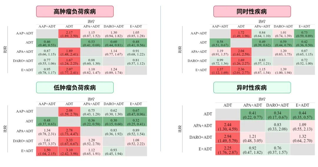 研究结果主要有以下几方面的发现:(1)总体上,不同ARPI方案相较于单独ADT,在不同肿瘤负荷和不同转移时间mHSPC患者中均有显著的rPFS获益;(2)与其他ARPI方案(阿比特龙,恩扎卢胺)相比,达罗他胺方案的rPFS并没有显著差异;(3)但在低瘤负荷疾病中,恩扎卢胺方案的rPFS显著优于阿比特龙方案(HR 0.67,95%CI:0.47-0.96);在同时转移性疾病患者中,恩扎卢胺方案的rPFS同样显著优于阿比特龙方案(HR 0.73,95%CI:0.59-0.89)。