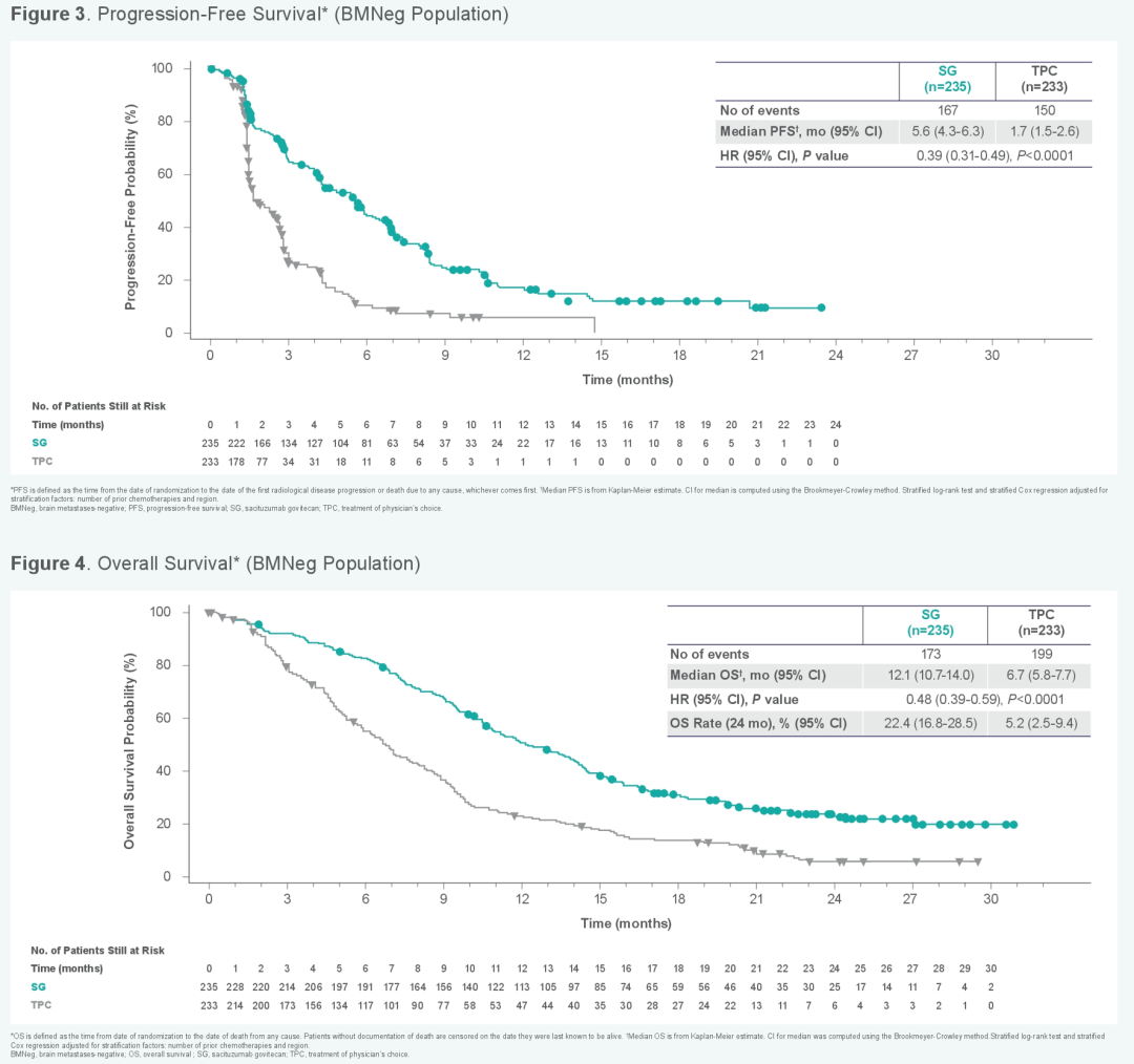 该适应症的获批主要基于多中心、随机、对照Ⅲ期ASCENT研究的结果。该研究纳入了529例紫杉类经治后进展的TNBC患者,按1:1随机分组后分别予以SG以及医生选择的治疗方案(TPC,包括卡培他滨、艾立布林、长春瑞滨或吉西他滨),直至出现疾病进展或不可耐受的毒性,主要研究终点为无脑转移人群的PFS,该人群患者共纳入了468例。最终疗效分析显示,在无脑转患者中,SG较TPC提升mPFS 3倍以上,为5.6个月vs 1.7个月,HR 0.39,95%CI:0.31~0.49,P<0.001;延长mOS接近2倍,为12.1个月vs 6.7个月,HR 0.48,95%CI:0.38~0.59,P<0.0001[10]。事后分析显示,无论Trop-2表达水平高低,患者均可从SG治疗中取得获益[11]