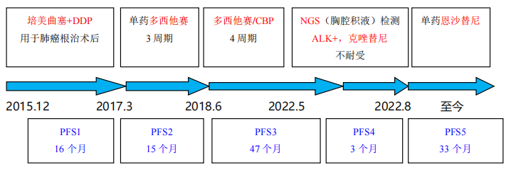 2016年1月复查CT提示支气管截断可见新发小结节,一线治疗采用培美曲塞+DDP方案化疗4周期(培美曲塞3.36,DDP 480mg)。化疗后复查胸部CT:右肺见不规则结节样影,最大层面大小约19mm*8mm,较前比较明显增大,疗效评估PD。2017.3-2017.4予单药多西他赛化疗3周期,疗效评估SD。2018年5月末复查CT提示结节较前增大,评效为PD,2018年6-10月予多西他赛+CBP化疗4周期,疗效评估SD。2022年5月患者出现活动后气短,复查胸部CT示右肺膨胀不良;右侧胸腔积液增多。胸腔积液包埋病理示符合肺腺癌细胞。行NGS基因检测:EML4:exon13-ALK:exon20融合。PD-L1(克隆号22C3)TPS<1%。