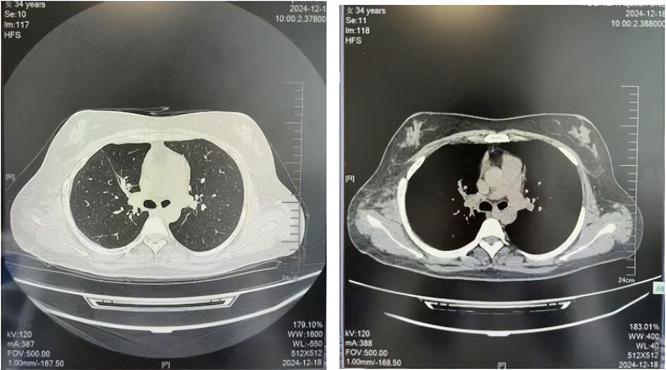 诊疗经过:2022年5月始口服克唑替尼3个月,出现肝功能异常(DILI 2级伴临床症状),改用恩沙替尼靶向治疗至今,目前评效为维持PR。恩沙替尼应用期间出现轻度肝功能异常(DILI 1级),对症处理后好转。截止目前PFS 33个月。