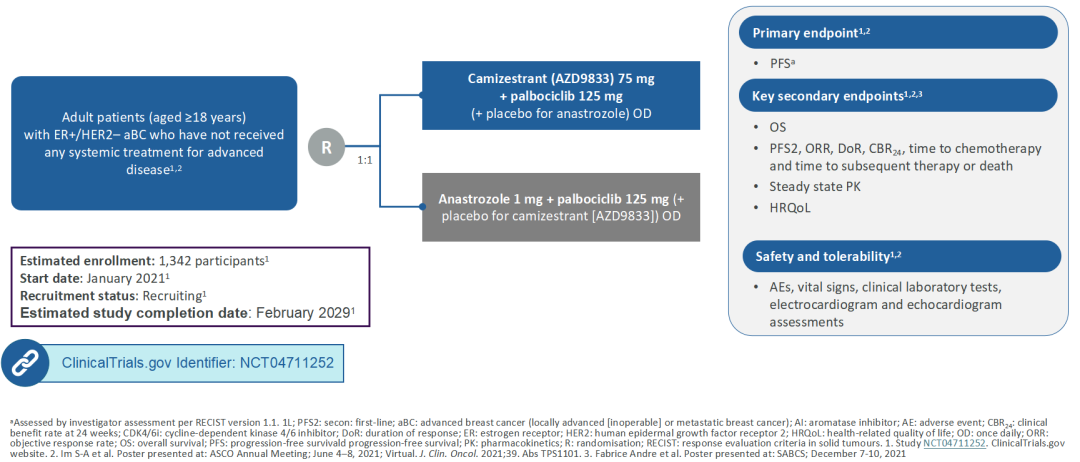 SERENA-4是一项多中心、随机双盲Ⅲ期研究,纳入既往未接受任何系统治疗的新诊断ER+/HER2-晚期乳腺癌患者,旨在评估Camizestrant联合哌柏西利对比阿那曲唑联合哌柏西利一线治疗的有效性和安全性,解答有关“在晚期初始治疗中,应用Camizestrant能否可进一步提升治疗获益”等关键问题。