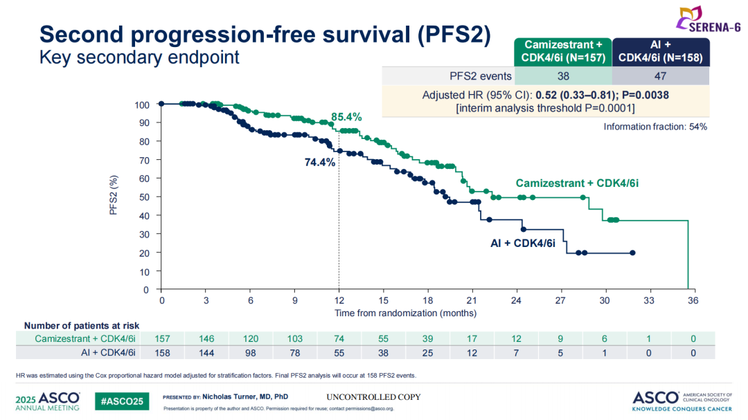 Camizestrant和AI治疗组中分别发生的38例和47例PFS 2事件,PFS 2的风险比为0.52(95%CI:0.33-0.81;27%成熟度)。OS数据尚不成熟(12%)。