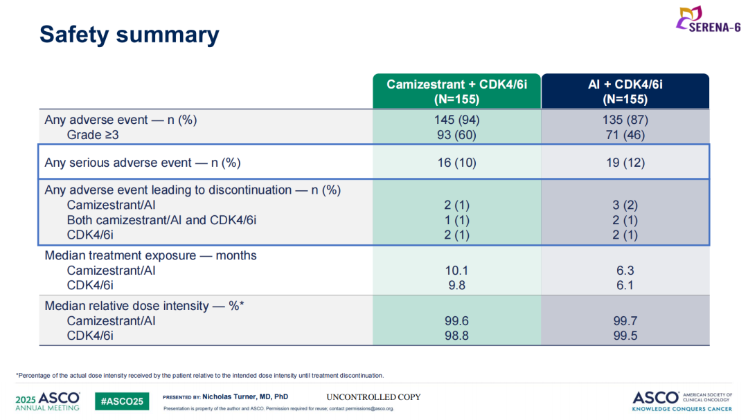 Camizestrant+CDK4/6抑制剂治疗组显示出了较好的耐受性和安全性。因不良反应导致治疗中断的比率,Camizestrant治疗组为1.3%,AI治疗组为1.9%。