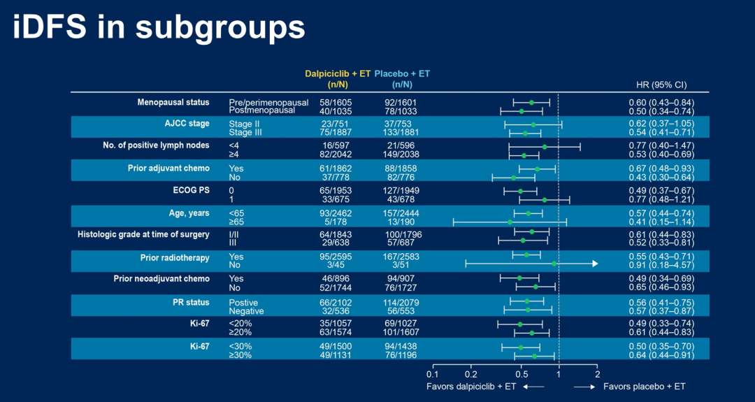 研究结果显示达到了主要终点,达尔西利组的2年IDFS率提高4.5%(94.7%vs 90.2%;HR 0.56,95%CI:0.43~0.71,P<0.0001),且不同亚组获益趋势一致。DFS(HR 0.53,2年提高5.2%)和无远处转移生存期(DDFS,HR 0.60,2年提高3.8%)也显示达尔西利组获益。达尔西利的治疗安全性和耐受性尚可,两组药物导致的停药(2.1%vs 0.8%)和严重不良事件(3.7%vs 1.5%)发生率相当。DAWNA-A研究为达尔西利用于高危HR+/HER2-乳腺癌辅助治疗提供高质量循证医学证据,也为中国乳腺癌患者提供了新的CDK4/6i辅助治疗选择。