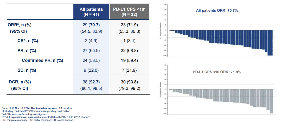 截至2024年11月18日,共纳入41例患者,中位年龄55岁;43.9%的患者ECOG PS评分为1;78.0%的患者PD-L1 CPS<10;61.0%的患者基线存在内脏转移,29.3%的患者有新发转移,19.5%的患者DFI为6-12个月(月),51.2%的患者DFI&gt;12个月。