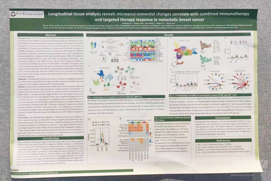 编者按:深入剖析肿瘤微环境的动态演变,有助于我们精准把握患者的治疗响应机制及疾病演进脉络。2025年ASCO大会上,中山大学孙逸仙纪念医院刘洁琼教授团队呈现了一项转移性乳腺癌治疗领域的创新研究(摘要号:1022)。该研究聚焦KN046与KN026联合疗法在二线及后线治疗失败的HER2阳性乳腺癌中的疗效与安全性,通过单细胞测序技术深入剖析治疗前后肿瘤微环境变化。研究发现,治疗敏感与耐药患者的免疫微环境存在显著差异,且基线期M?/LEC细胞比值可有效预测疗效,为乳腺癌个体化精准治疗提供了新思路,本文特进行介绍。