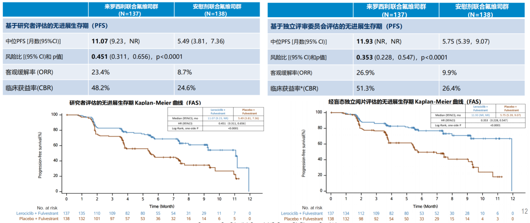 既往发表于《Nature Communications》的结果显示达到了主要终点——研究者评估的无进展生存期(PFS)[5]。来罗西利+氟维司群组的中位PFS是氟维司群组的2倍,分别为11.07个月和5.49个月,HR仅为0.451(95%CI:0.311~0.656,P<0.0001);次要终点之一独立评审委员会(IRC)评估的PFS表现一致(11.93 vs 5.75个月,HR 0.353,95%CI:0.228~0.547,P<0.0001)。