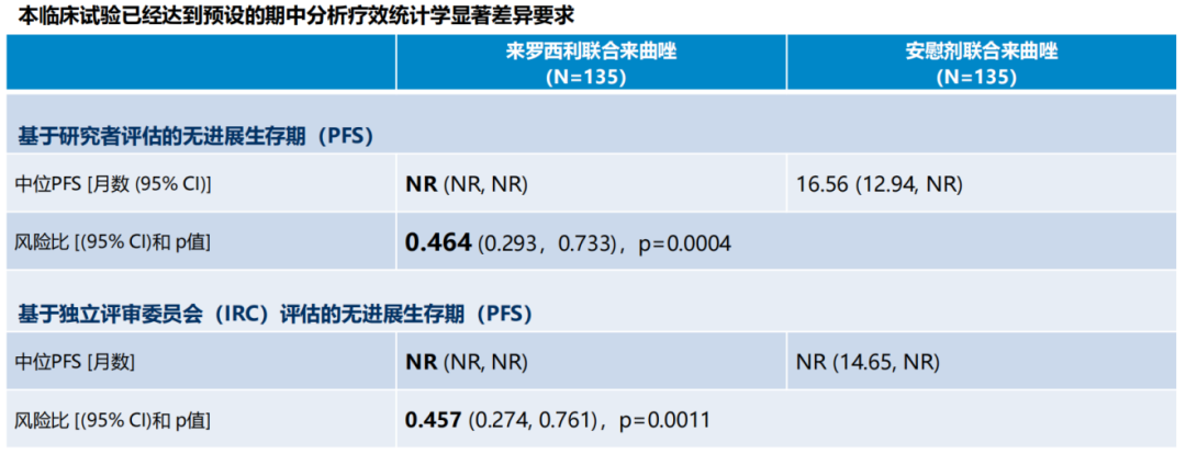 该研究已经达到预设的期中分析疗效统计学显著差异要求,来罗西利+来曲唑组和安慰剂+来曲唑组研究者评估的PFS分别为NR和16.56个月,疾病进展或死亡风险显著降低53.6%(HR 0.464;95%CI:0.293~0.733;P=0.0004);独立评审委员会(IRC)评估的PFS也保持一致获益(NR vs NR;HR 0.457,95%CI:0.274~0.761,P=0.0011)。而且从已报道的CDK4/6i一线治疗研究来看,来罗西利的HR(0.4464)同样位于较低水平,患者的PFS获益幅度非常大[13-14]
