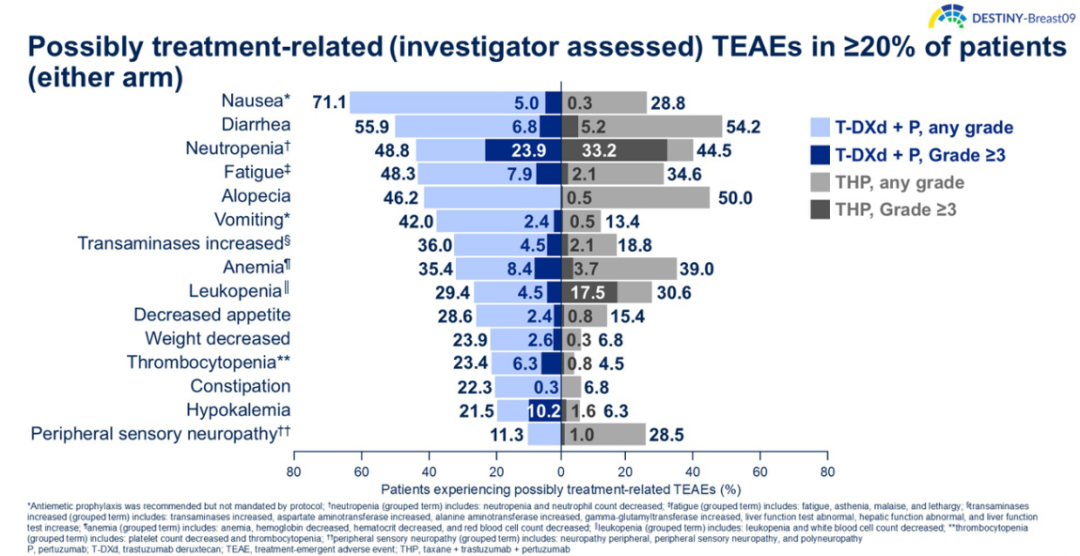 在一线治疗中,T-DXd联合帕妥珠单抗未出现新的安全性信号。此外,基于3级或以上治疗相关不良事件(54.9%vs 52.4%)和严重治疗相关不良事件(27.0%vs 25.1%)的相似发生率,联合方案的安全性特征与THP相比无显著差异。“然而,T-DXd联合帕妥珠单抗组的中位总治疗时间更长,且某些不良事件(如恶心、呕吐和便秘)更为常见,”Tolaney博士指出。