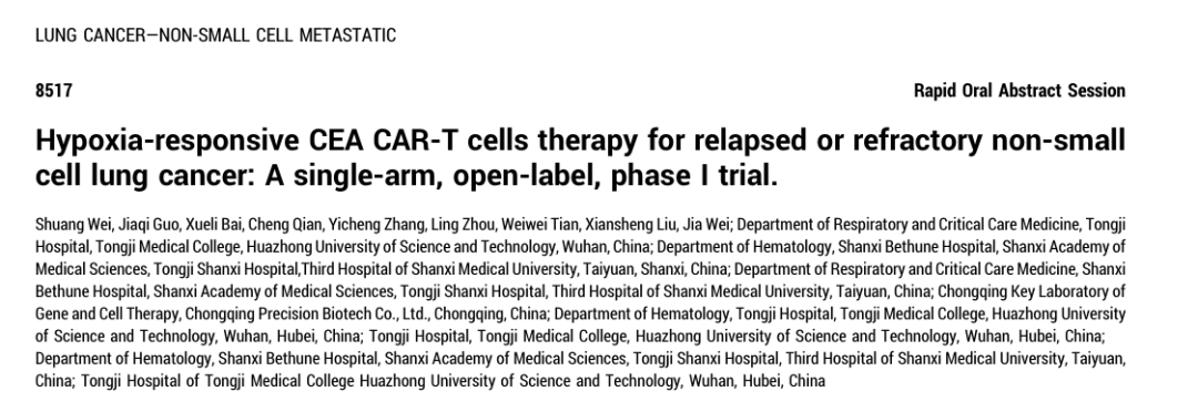 ASCO中国之声丨隗佳&魏双教授团队:聚焦复发难治性非小细胞肺癌,中国自主研发低氧响应性CEA CAR-T细胞疗法崭露头角