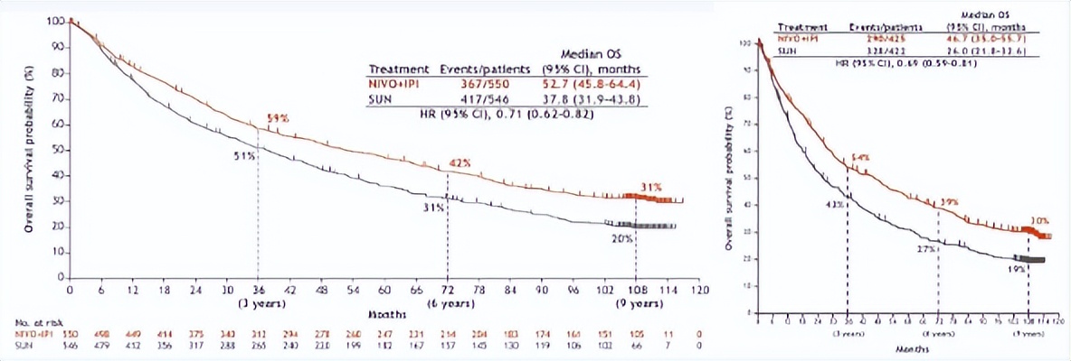 在晚期肾细胞癌(aRCC)中,一线使用免疫检查抑制剂联合治疗的最长和最终第3阶段随访(9年)中,与舒尼替尼相比,OS和PFS的里程碑率以及持久应答仍保持较高水平。未出现新的安全信号。