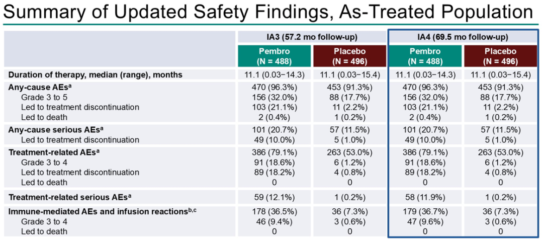 经过5年的随访,与安慰剂相比,帕博利珠单抗辅助治疗获益与既往分析一致,包括在所有亚组。没有发生新的严重治疗相关安全信号。帕博利珠单抗辅助治疗仍然是RCC复发风险增加患者的一线治疗选择。
