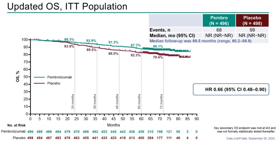 共994例患者被随机分配接受帕博利珠单抗(n=496)或安慰剂(n=98)治疗。截至2024年9月25日的数据截止日期,中位随访时间为69.5个月。所有患者在3年前完成了或停止了研究治疗。帕博利珠单抗组和安慰剂组分别发生了188例和241例DFS事件。中位DFS未达到(NR),而安慰剂组为68.3个月(HR 0.71,95%CI0.59-0.86);5年时的估计DFS率分别为60.9%和52.2%。帕博利珠单抗组和安慰剂组分别发生了68例和99例OS事件。两组的中位OS均为NR(HR 0.66,95%CI 0.48-0.90);5年时的估计OS率分别为87.7%和82.3%。DFS和OS结果在包括预先规定的风险和肉瘤样特征在内的关键亚组中是一致的。在3年内没有报告新的严重治疗相关不良反应。