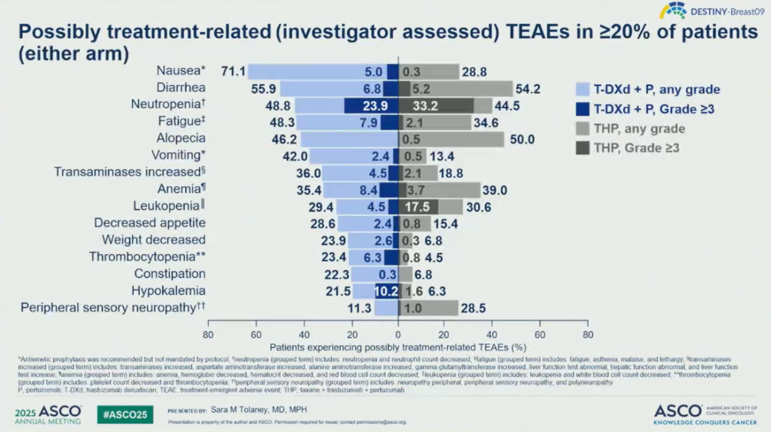 [1]Sara M.Tolaney,et al.Trastuzumab deruxtecan(T-DXd)+pertuzumab(P)vs taxane+trastuzumab+pertuzumab(THP)for first-line(1L)treatment of patients(pts)with human epidermal growth factor receptor 2–positive(HER2+)advanced/metastatic breast cancer(a/mBC):Interim results from DESTINY-Breast09.2025 ASCO LBA 1008.