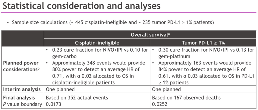CheckMate-901的早期结果表明,对于肿瘤细胞表达PD-L1≥1%的患者,与吉西他滨联合铂类化疗相比,纳武利尤单抗联合伊匹木单抗并未改善OS(HR 0.87;P=0.364;P值界值为0.0252)。在van der Heijden报告的一组不适合顺铂治疗的患者中,OS的HR为0.79(P=0.0245;P值界值为0.0173),中位随访时间为69个月。
