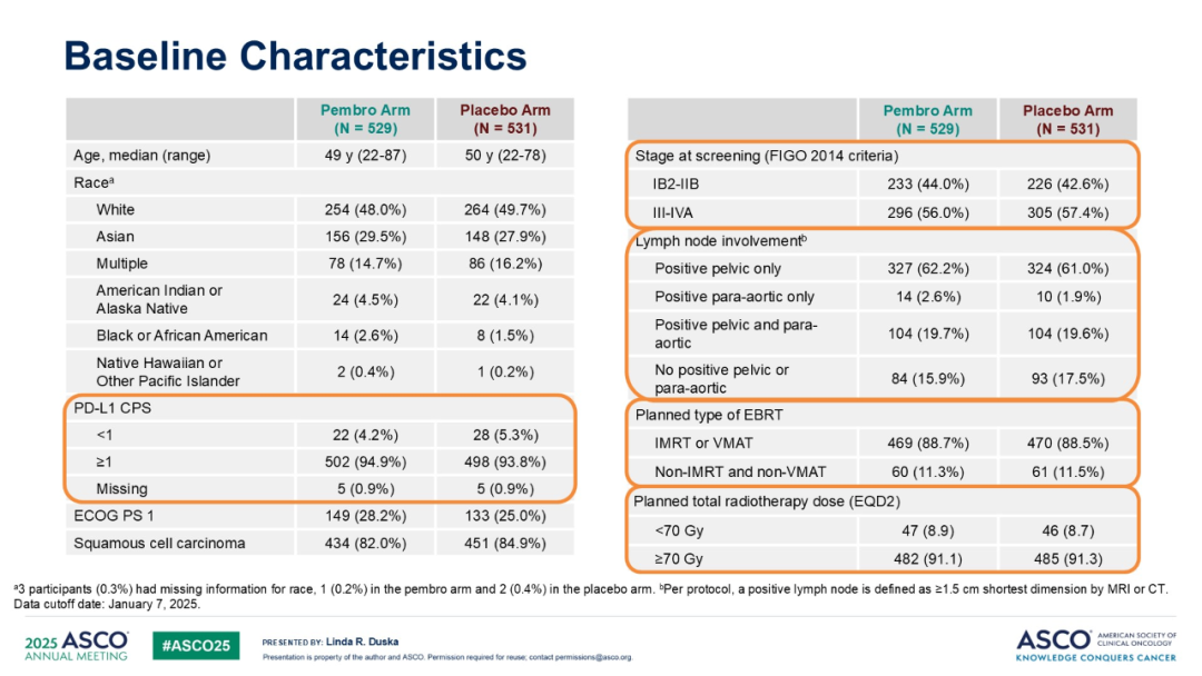 这项随机、双盲、III期临床试验招募了初治高危局部晚期宫颈癌患者,其定义为FIGO 2014 IB2-IIB期(淋巴结阳性)或FIGO 2014 III-IVA期(不考虑淋巴结状态)。患者(n=1060)按1:1的比例随机分配至帕博利珠单抗组或安慰剂组:接受40mg/m2顺铂(每周一次,共5个周期)联合外照射放疗(EBRT)序贯近距离放射治疗,每3周接受200mg帕博利珠单抗或安慰剂,共5个周期;之后每6周接受400mg帕博利珠单抗或安慰剂,共15个周期。该研究的两个主要终点是基于RECIST1.1标准评估的无进展生存(PFS)和总生存(OS)。