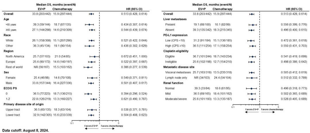 亚组分析显示不同预设亚组患者继续保持一致的OS获益,包括不同原发部位(上尿道和下尿道)、疾病转移部位(内脏转移或仅淋巴结转移)、PD-L1阳性(CPS≥10)或阴性(CPS<10)、是否肝转移等患者均可从维恩妥尤单抗联合帕博利珠单抗治疗中降低死亡风险,尤其该治疗方案的获益不受PD-L1表达水平影响(PD-L1阳性和阴性患者HR分别为0.550和0.472)。此外,此次延长随访的数据中,不同亚组的PFS、客观缓解率(ORR)、持续缓解时间(DoR)同样证实了维恩妥尤单抗联合方案的持续获益[5]。