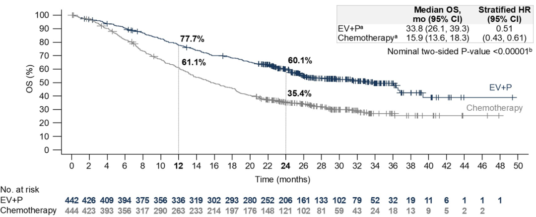 [5].Powles T,Van Der Heijden M S,Loriot Y,et al.EV-302:Updated analysis from the phase 3 global study of enfortumab vedotin in combination with pembrolizumab(EV+P)vs chemotherapy(chemo)in previously untreated locally advanced or metastatic urothelial carcinoma(la/mUC)[J].JCO 43,664-664(2025).