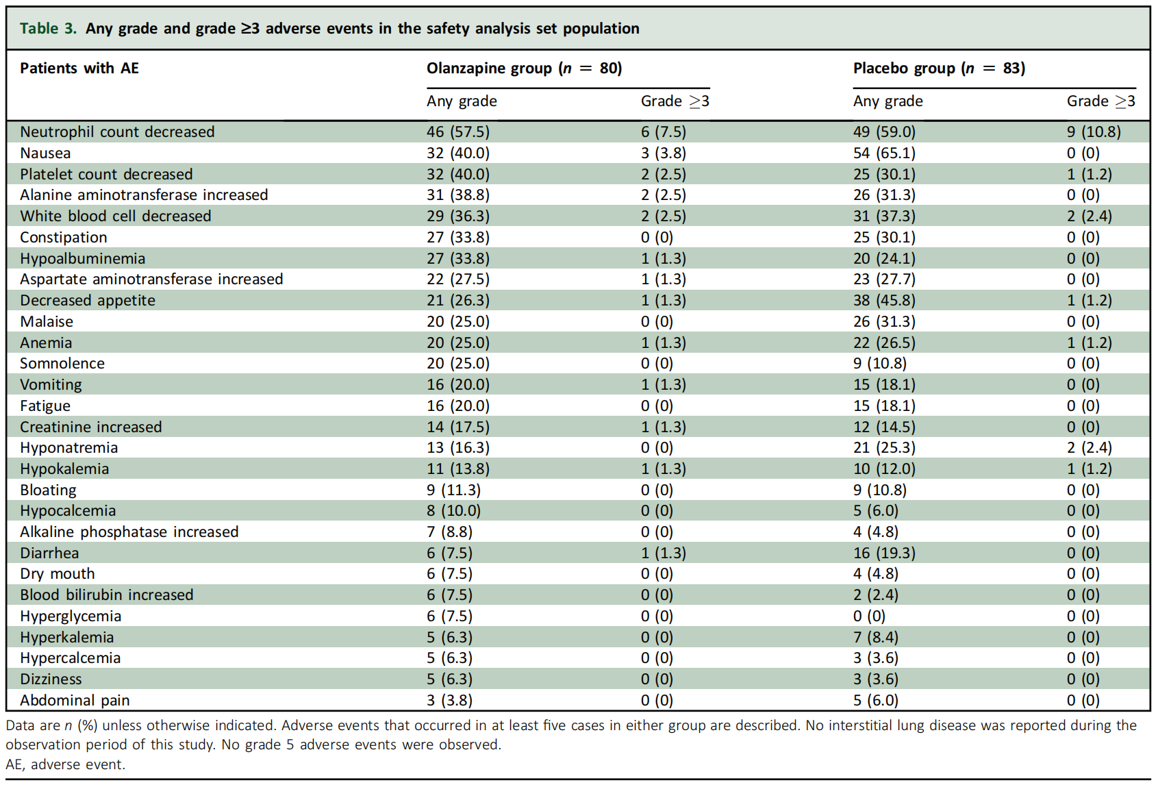在安全性方面,奥氮平组的不良事件主要为嗜睡(25.0%)和高血糖(7.5%),但均为低级别,未出现≥3级的事件。相比之下,安慰剂组的嗜睡发生率为10.8%,未发生高血糖。此外,奥氮平组的食欲减退(26.3%vs 45.8%)和腹泻(7.5%vs 19.3%)发生率也低于安慰剂组,这与PRO-CTCAE评估结果一致。