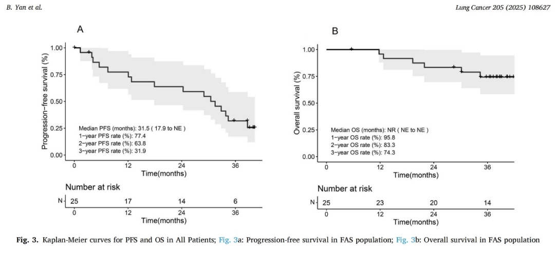 共纳入25例合格患者(A部分12例,B部分13例)。中位年龄59岁(38-77岁),女性11例,ECOG评分1分24例,21 L858R突变11例,基线脑转移6例。确定RP2D为奥希替尼80mg每日一次联合安罗替尼12mg每日一次(口服14天,停药7天)。数据截止日期(2024年6月20日),全分析集(FAS)的确认ORR为60.0%(95%CI:38.7%-78.9%),其中15例部分缓解(PR),7例疾病稳定(SD),1例疾病进展(PD),2例无法评估;DCR为88.0%(95%CI:68.8%-97.5%)。中位肿瘤缓解深度为-41.6%(95%CI:-57.1%至-26.3%),中位DoR为32.3个月(95%CI:23.9个月-未达到)。中位随访39.2个月,中位PFS和OS分别为31.5个月(95%CI:17.9个月-未达到)和未达到,36个月PFS率和OS率分别为31.9%和74.3%。亚组分析显示,基线无脑转移患者的中位PFS显著优于脑转移患者(33.8个月vs 12.8个月,P=0.012);19Del与21L858R突变患者的中位PFS相似(30.5个月vs 34.4个月,P=0.406)。在19例接受RP2D治疗的患者中,ORR和DCR分别为52.6%和89.5%,中位PFS为29.7个月(95%CI:12.1-未达到),3年OS率为66.2%。