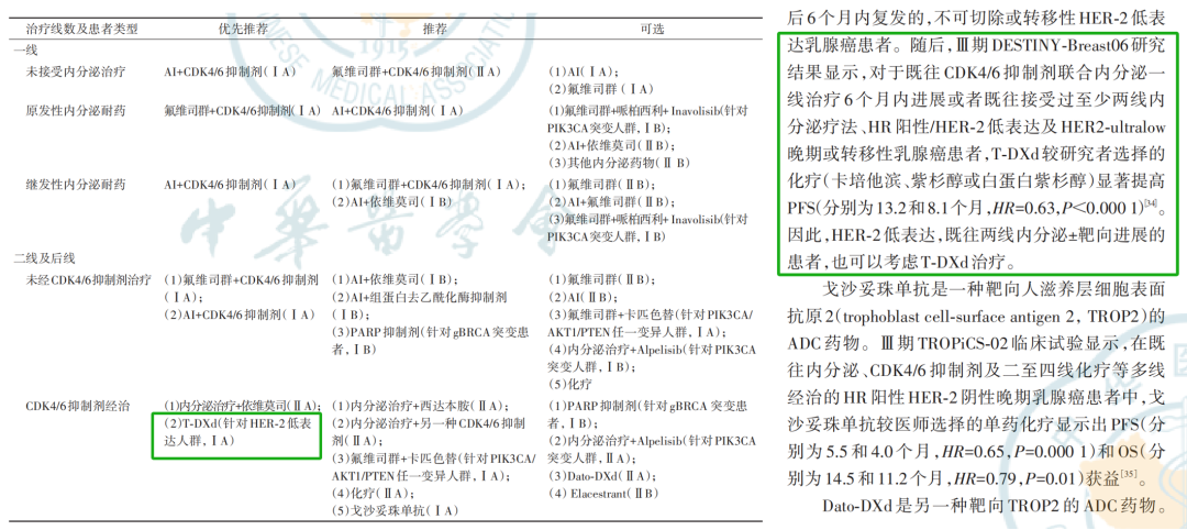 国内最新版的CSCO-BC(2025)、CACA-CBCS精要版(2025)、ABCC指南(2024),针对CDK4/6i+ET经治患者,均推荐T-DXd作为HER2低表达患者的优选方案;而鉴于药物可及性,靶向联合内分泌治疗(如mTORi+ET)在国内指南中仍是CDK4/6i+ET经治患者的优选方案之一,但需注意mTORi目前缺乏CDK4/6i经治的高质量循证医学证据。此外,由于T-DXd超低表达国内适应症尚在审批中,国内指南尚未列入推荐,但已经在注释中引用或介绍了DB-06的循证医学证据。相信随着相关适应症获批,国内指南对T-DXd在post-CDK4/6i中的应用推荐会进一步扩大。