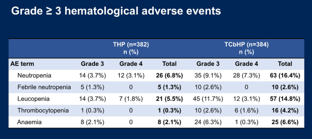 在安全性方面,与TCbHP组相比,THP组患者的3-4级不良事件(20.7%vs 34.6%)和严重不良事件(1.3%vs 4.7%)的发生率更低。由此可见,THP方案相较于TCbHP方案,毒性更低。此外,THP方案尤其在≥3级血液学不良事件方面表现更优。去掉卡铂后,相关不良事件的发生率降低,因此该方案更容易被临床接受,患者治疗感受也会更好。所以,我认为这是具有突破性的治疗进展。