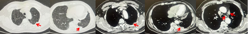 2024.11.19患者出现右侧胸痛,复查胸部CT检查示右侧胸膜肿物,大小约31mmX24mm,右侧4、5肋骨骨质破坏,考虑转移(如图2)。建议患者穿刺活检取病理明确诊断,患者拒绝,经MDT会诊后结合影像学表现及病史考虑为胸膜转移,肋骨转移,分期为rT0N0M1a IVA期,DFS仅仅17个月。2024.12.05起行信迪利单抗联合培美曲塞+卡铂方案治疗4周期,复查胸CT评效PR(如图3)。之后给予信迪利单抗+培美曲塞维持治疗6周期,期间复查CT评效PR(如图3)。目前信迪利单抗+培美曲塞维持治疗中,截止至目前PFS约为8个月,治疗期间未出现明显毒副反应。
