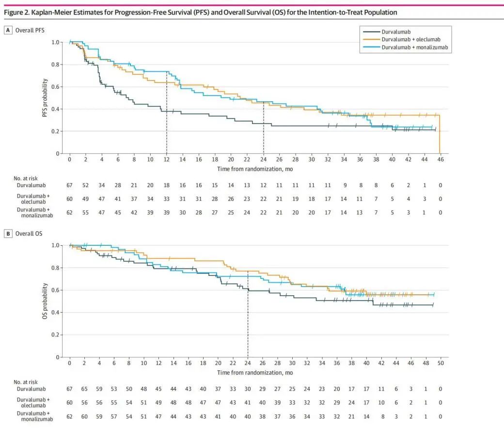数据分析时,度伐利尤单抗单药、联合Oleclumab、联合Monalizumab的ORR分别为23.9%、35.0%和40.3%,中位PFS分别为7.3个月,21.1个月和19.8个月,HR分别为0.59和0.63,12个月PFS率分别为37.6%,63.5%和73.2%。