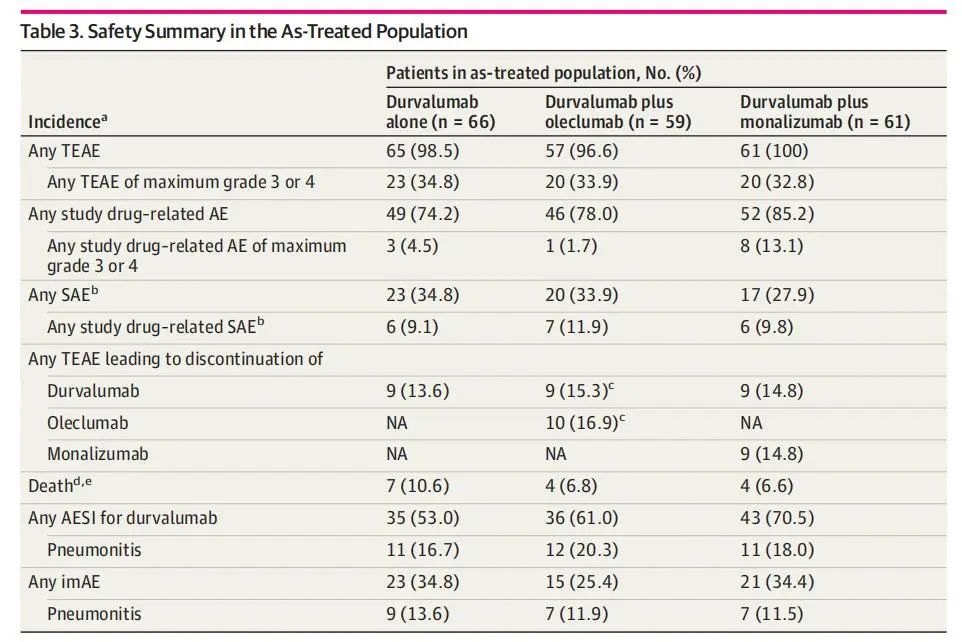 研究中,队列1接受新辅助度伐利尤单抗联合化疗联合Oleclumab随后接受手术,术后给予辅助度伐利尤单抗联合Oleclumab治疗;队列2接受新辅助度伐利尤单抗联合含铂双药治疗联合Monalizumab,随后手术,术后接受度伐利尤单抗联合Monalizumab治疗;队列4接受度伐利尤单抗联合Dato-Dxd以及单药铂类治疗,随后进行手术,患者分期为IIa-IIIb期,不携带驱动基因突变。