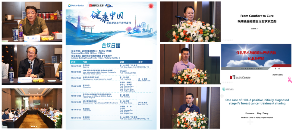 8月14日下午,户井雅和教授应邀来到北京市参加学术交流会议,会议由首都医科大学北京同仁医院关山教授和首都医科大学附属北京天坛医院尹子毅教授主持。户井雅和教授做出了题为《HER2靶向治疗在晚期乳腺癌中的新进展》的主题演讲。户井雅和教授讲到,HER2异质性是HER2阳性晚期乳腺癌治疗过程中的一大挑战。新一代的ADC药物如T-DXd凭借旁观者效应,可以有效对HER2阳性肿瘤细胞周围的HER2阴性肿瘤细胞进行有效杀伤,从而提高疗效。在最近举行的美国临床肿瘤学会(ASCO)2025年会上,T-DXd用于HER2阳性晚期乳腺癌1线治疗的临床试验(DB-09)结果首次公布,DB-09研究结果支持T-DXd联合帕妥珠单抗成为HER2阳性转移性乳腺癌1线治疗的新选择。参与此次交流的北京市的乳腺肿瘤专家学者们就保乳手术、淋巴结活检、未来HER2阳性乳腺癌的1线治疗策略等热点问题与户井雅和教授展开了热烈讨论。
