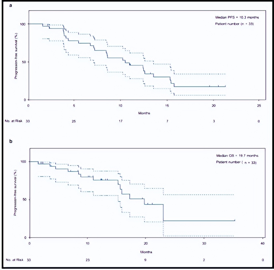 图3.I期临床研究入组33例患者的PFS、OS和ORR数据