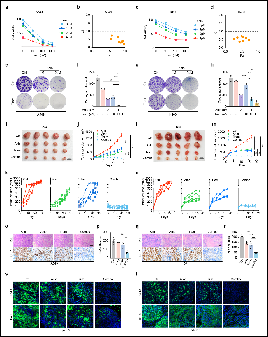 图2.曲美替尼和安罗替尼联合靶向MEK和RTKs抑制KRAS突变型NSCLC进展