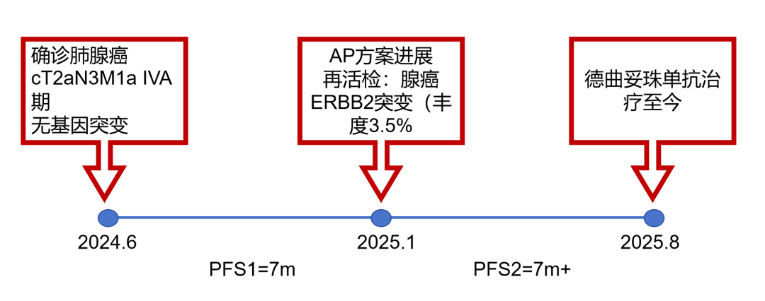 病例1:患者男,68岁。2024年6月以“胸闷气短1个月”为主诉于当地医院检查治疗。查CT提示左肺下叶肿物,纵隔、双肺门多发肿大淋巴结,左侧胸腔积液,左侧胸膜增厚。于当地医院行胸水穿刺引流查癌细胞提示肺腺癌。临床分期:cT2aN3M1a IVA期。患者于当地医院行血液基因检测未见敏感突变,使用AP方案化疗后病情进展。2025-1入我院后行肺穿刺活检,病例提示腺癌。行基因检测提示:ERBB2突变(丰度3.5%)。行德曲妥珠单抗(T-DXd)治疗至今。最佳疗效PR,目前持续有效中,PFS已超过7个月。患者使用德曲妥珠单抗期间出现II级恶心呕吐,经对症治疗可缓解。
