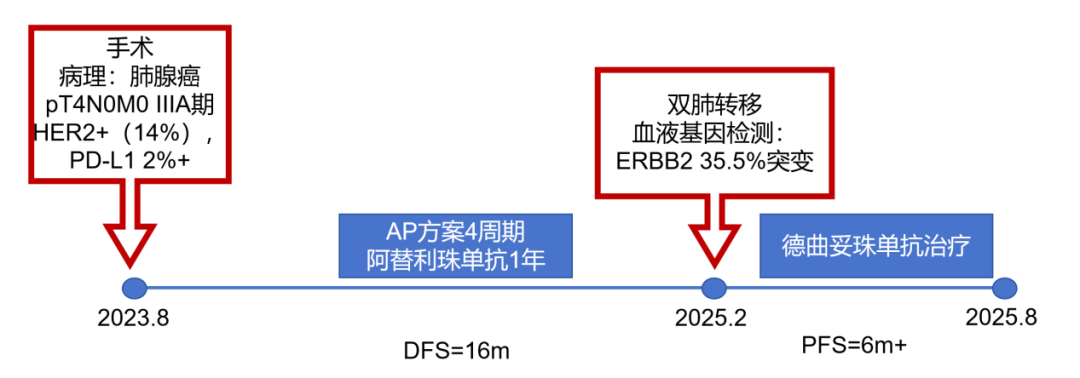 病例2:患者男,61岁。2023年8月于外院行肺CT提示:右肺下叶肿块。2023年10月23日于我院行单孔胸腔镜下右肺下叶切除术、肺门纵隔淋巴结扩清术。术后病理:腺癌低分化(腺泡型占30%,乳头型占30%,筛状占30%,微乳头占10%)。分期pT4N0M0 IIIA期。术后行基因检测提示HER2+(14%),PD-L1 2%+。术后行AC方案化疗4周期后行阿替利珠单抗维持治疗1年。末次用药时间:2024年11月1日。2025年2月复查肿瘤标志物升高,肺HRCT示:双肺多发结节,考虑转移。行血液基因检测提示:ERBB2 35.5%突变,CDK1 9.5%突变,MDM2 4.92%突变。患者DFS 14m,阿替利珠单抗停药后3个月出现复发转移,可见传统免疫治疗效果不佳。恰逢德曲妥珠单抗一线新尝试DESTINY-lung 04研究公布了入组标准和治疗方案,且该患在术后的组织基因检测和复发后的血液基因检测中都明确存在HER2突变,故行德曲妥珠单抗一线治疗。最佳疗效PR,目前治疗持续有效,PFS超过6个月。无药物相关不良反应发生。