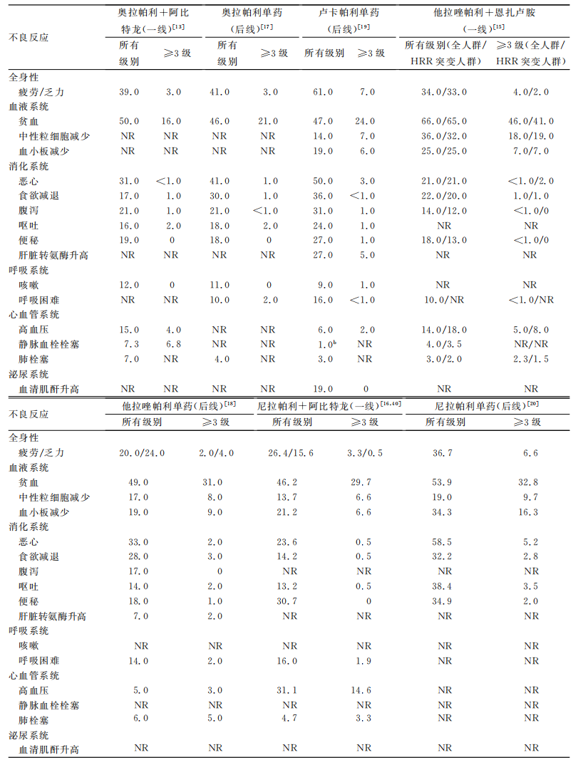 表1.不同PARPi单药治疗或联合治疗的血液学和非血液学不良事件发生率