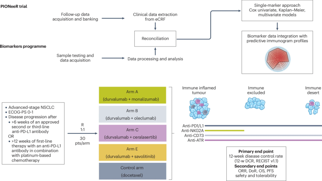平台式临床研究PIONeeR即是应对这些挑战专门设计的研究之一,它将广泛的转化研究与自适应平台式临床研究策略整合到一起,以加速识别有效的疗法,也是目前最具转化价值的研究,还证实了重复肿瘤活检取样和复杂的分子分析,能在与真实世界相仿的诊疗场景中成功进行。该研究共纳入439例PD-1/L1抑制剂耐药的晚期NSCLC患者,并采集基线组织、血液和粪便样本,还在治疗开始后第6周补充选择性再活检(实际取样率33%),从而分析了超过450份组织和血液样本,寻找生物标志物并预测疗效。对研究过程中发生疾病进展的患者,该研究的“自适应平台”式设计会将患者随机化分入多个不同试验组,运用贝叶斯分析法动态识别合适的治疗方案。尽管研究疗效数据并不亮眼,但该研究更多是概念验证性(疗效并非主要终点),证实可快速调整临床研究中的试验臂(Arm),以应对ICI耐药NSCLC的复杂性和不确定性。