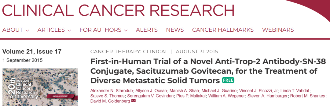 [1]Starodub AN,Ocean AJ,Shah MA,et al.First-in-Human Trial of a Novel Anti-Trop-2 Antibody-SN-38 Conjugate,Sacituzumab Govitecan,for the Treatment of Diverse Metastatic Solid Tumors.Clin Cancer Res.2015;21(17):3870-3878.doi:10.1158/1078-0432.CCR-14-3321