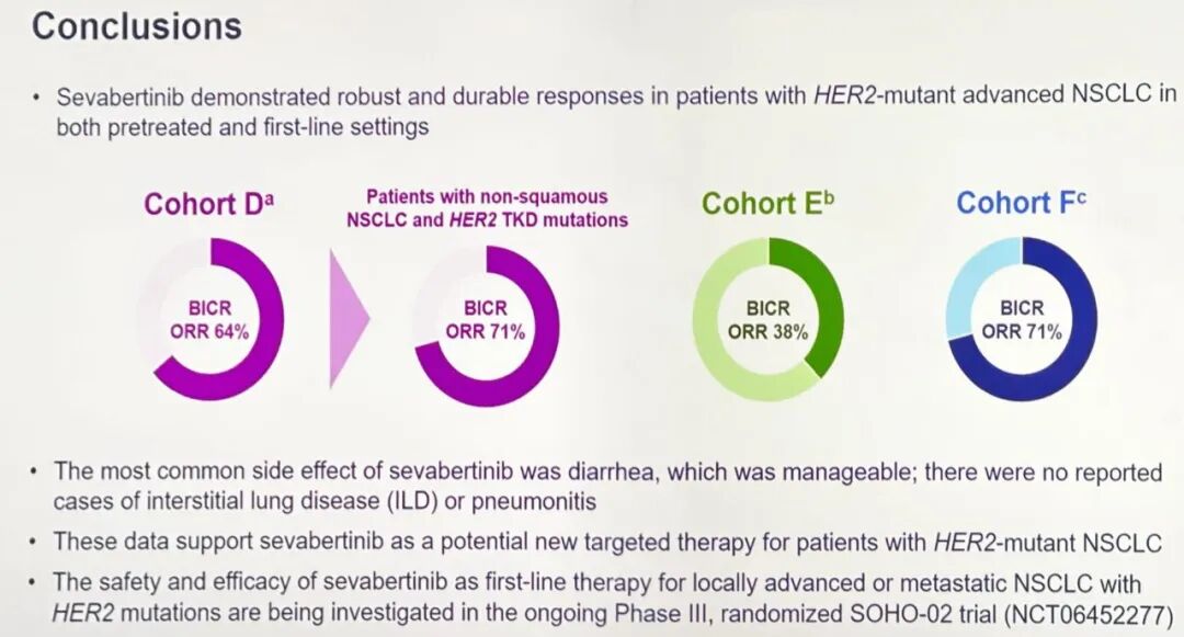 研究者认为sevabertinib在经治和一线阶段HER2突变NSCLC患者中均表现出显著且持久的疗效,这些数据支持sevabertinib作为HER2突变NSCLC患者一种潜在的新靶向疗法。该药物正在III期SOHO-02试验(NCT06452277)中作为伴有HER2突变的局部晚期或转移性NSCLC患者的一线疗法进行评估。
