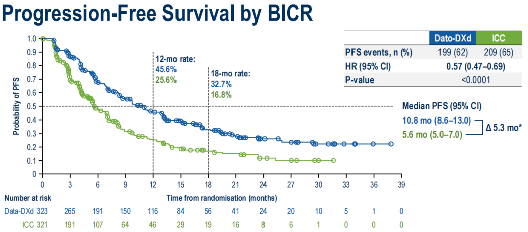 Dato-DXd组vs ICC组(BICR评估):10.8个月vs 5.6个月,HR 0.57(95%CI:0.47-0.69);P<0.0001。Dato-DXd组相较于化疗组使患者中位PFS延长5.3个月,疾病进展或复发风险降低43%。研究者评估的PFS与BICR评估的PFS一致。