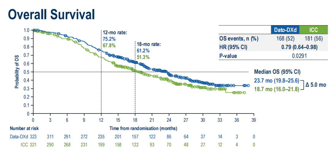 Dato-DXd组vs ICC组:23.7个月vs 18.7个月,HR 0.79(95%CI:0.64-0.98);P=0.0291。