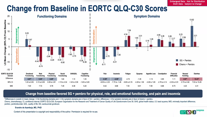 [7]Evandro De Azambuja,Peter Schmid,Kevin M.Kalinsky,et al.LBA22-Patient-reported outcomes(PROs)with sacituzumab govitecan(SG)+pembrolizumab(pembro)vs chemotherapy(chemo)+pembro in patients(pts)with previously untreated PD-L1+metastatic triple-negative breast cancer(mTNBC)in the phase III ASCENT-04/KEYNOTE-D19 study 2025 ESMO LBA22.