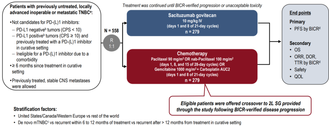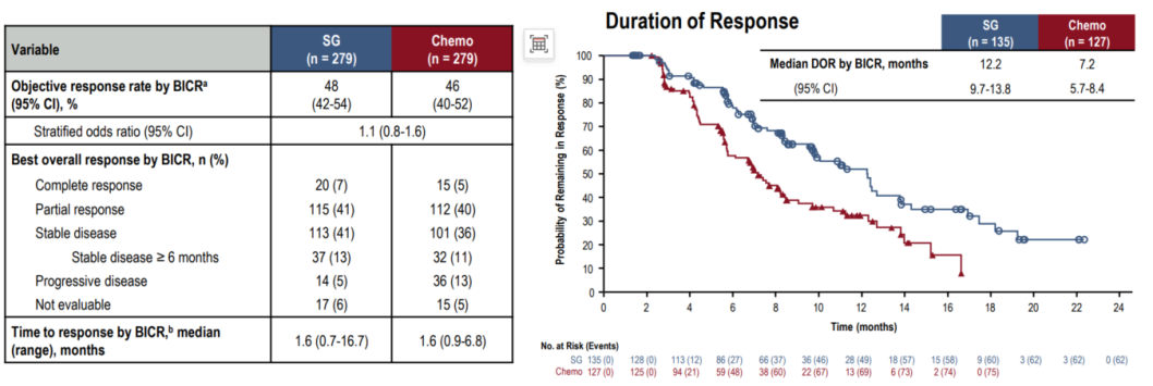 该研究共纳入588例患者,按1:1随机分组,分别予以SG或医生选择的化疗(TPC,包括单药或联合化疗)进行一线治疗。两组各基线水平一致,且贴近临床实践:其中初诊转移约占30%,其余为复发晚期,约20%为根治性治疗结束6-12个月复发患者,约50%为根治性治疗结束后12个月以上复发患者;约60%的患者存在肺转移、约30%存在肝转移、5%存在脑转移。研究的主要终点是盲态独立评审中心(BICR)根据RECIST v1.1评估的PFS;次要终点包括总生存期(OS)、客观缓解率(ORR)、缓解持续时间(DoR)、安全性等。