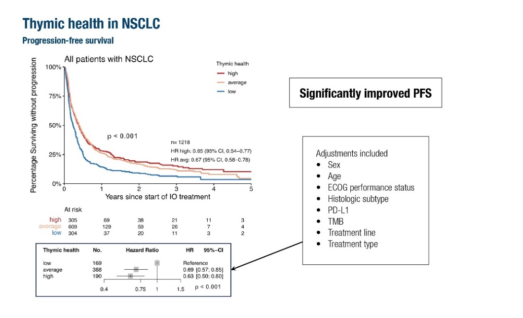 在接受免疫治疗的HARVARD-NSCLC非小细胞肺癌患者队列中,与胸腺健康程度低的患者相比,胸腺健康程度高的患者与PFS显著改善相关