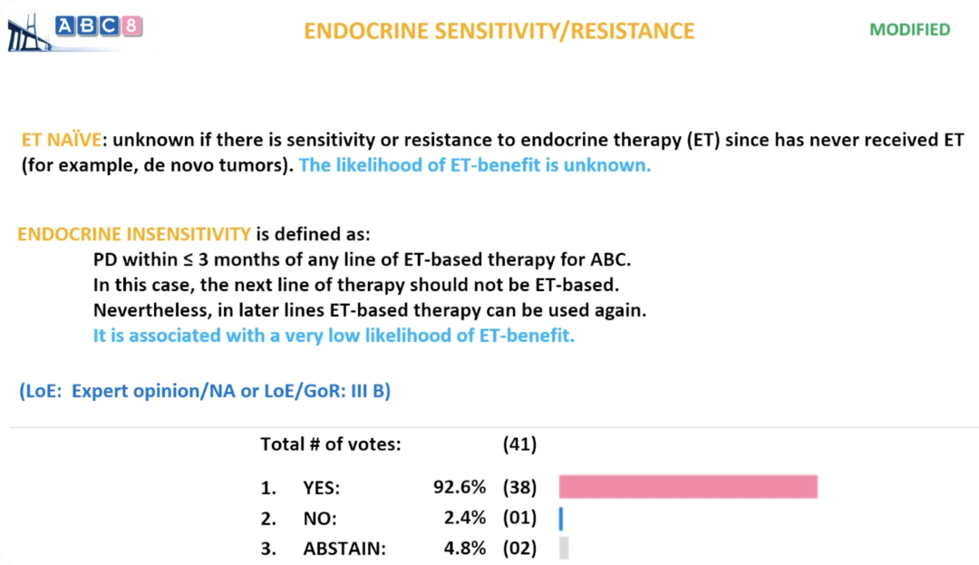 ABC接受任何线数以内分泌治疗为基础的方案治疗3个月内出现疾病进展(PD)。在此情况下,后续下一线治疗不应采用以内分泌治疗为基础的方案。然而,在更后线的治疗中仍可再次尝试内分泌治疗。该情况与内分泌治疗获益可能性极低相关。