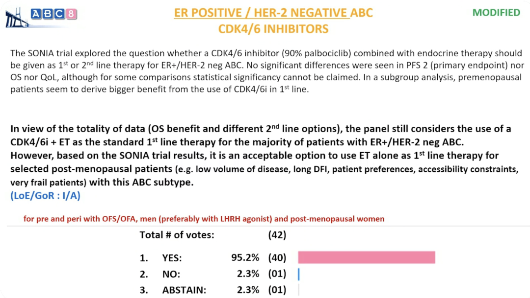 基于总体数据(OS获益及不同的二线治疗选择),专家组仍认为CDK4/6i+ET是大多数ER+/HER2-ABC患者的标准一线治疗方案。但根据SONIA试验结果,对于某些特定的绝经后ABC患者(如低肿瘤负荷、长无病间期、患者意愿、可及性限制、极度虚弱患者),单独使用内分泌治疗作为一线方案也是可接受的选择。