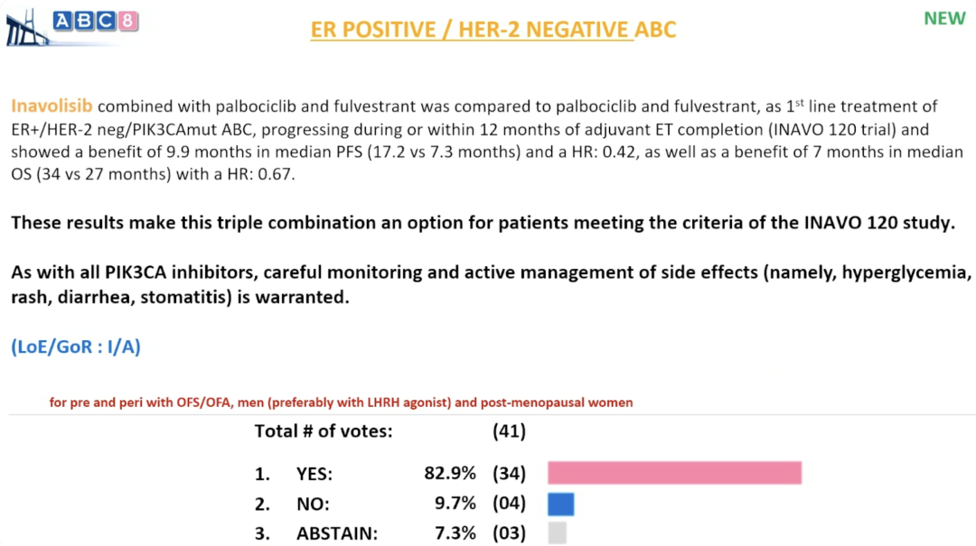 对于在辅助内分泌治疗期间或完成治疗后12个月内进展且存在PIK3CA突变的晚期ER+/HER2-乳腺癌患者,INAVO 120研究评估了伊那利塞+哌柏西利+氟维司群对比哌柏西利+氟维司群一线治疗的疗效。结果显示,三联方案的中位PFS显著延长9.9个月(17.2 vs 7.3个月),HR 0.42;中位OS延长7个月(34 vs 27个月),HR 0.67。