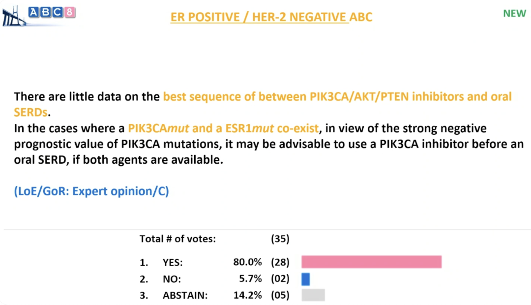 当患者同时存在PIK3CA突变和ESR1突变时,考虑到PIK3CA突变有明确的不良预后价值,若两种药物均可及,建议优先使用PIK3CA抑制剂,再使用口服SERD。